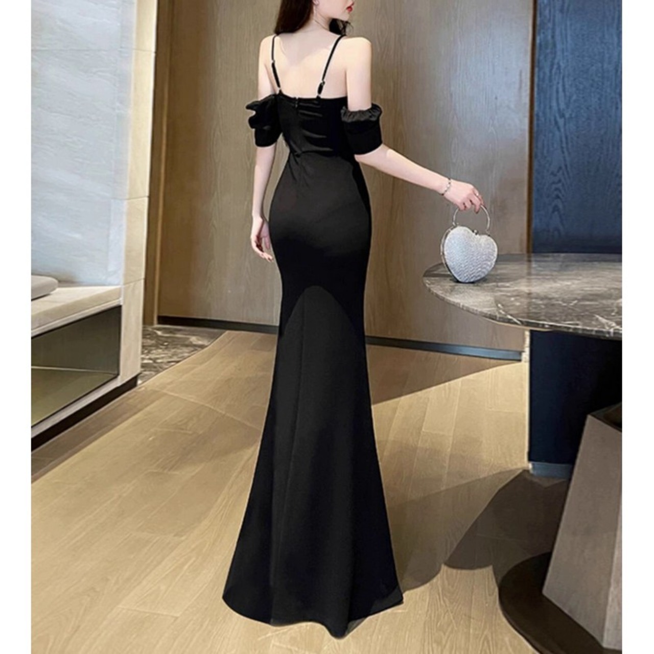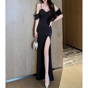 とろみのあるシフォン袖と深めスリットで、気品と色気を両立。