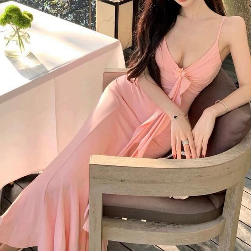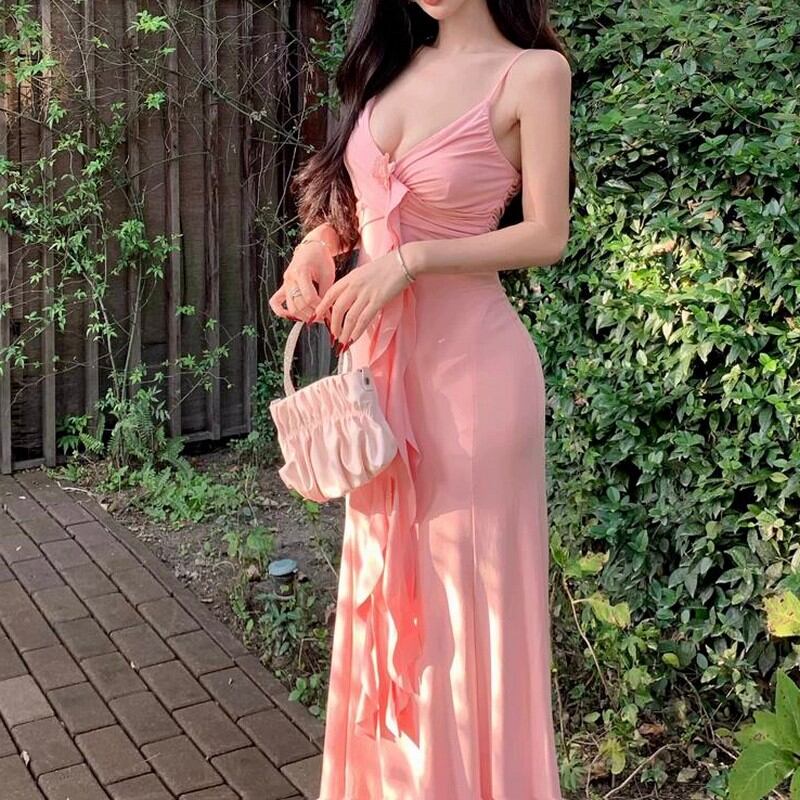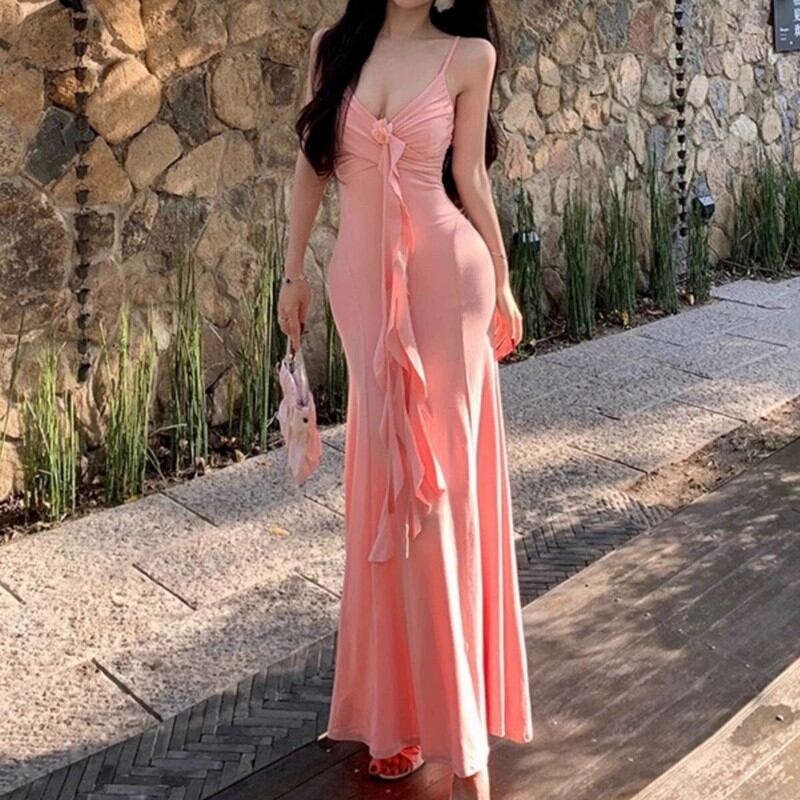 胸元にあしらわれた花のモチーフと流れるようなフリルが、柔らかくフェミニンな印象を引き立てます。