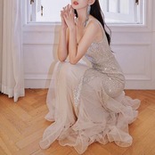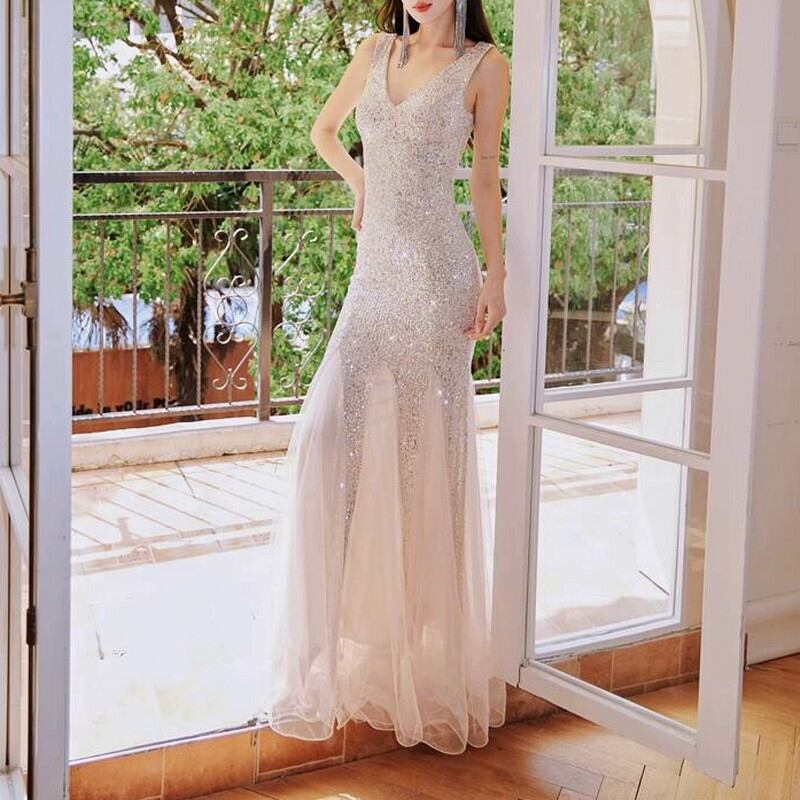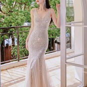 全身に散りばめられたスパンコールが、光を受けて上品に輝くロングドレス。