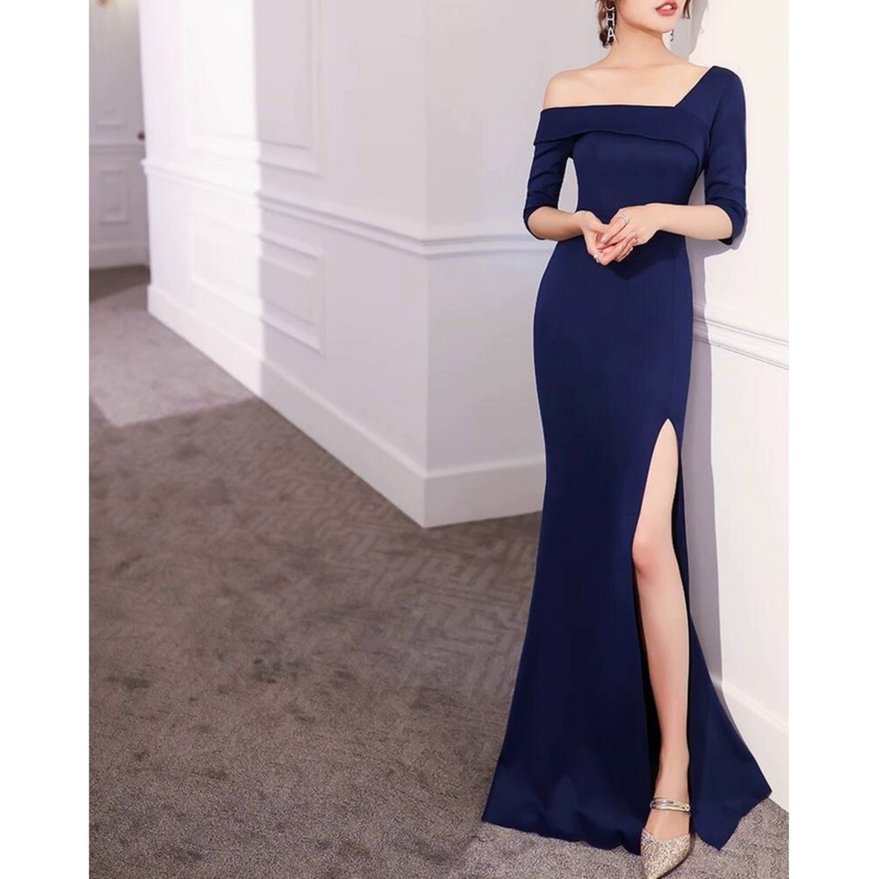 片側オフショルダーのカットが洗練された印象を与える、品格漂う一着。