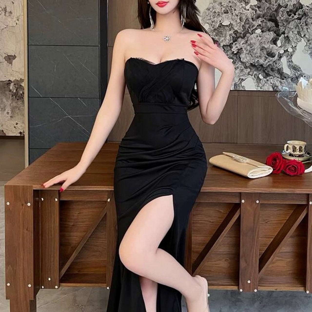 胸元のドレープとウエストラインのタックが、ボディラインを美しく引き立てるシルエット。